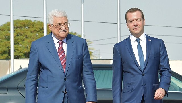 Премьер-министр РФ Дмитрий Медведев и глава Палестины Махмуд Аббас приняли участие в церемонии передачи учебников русского языка для арабских школьников.